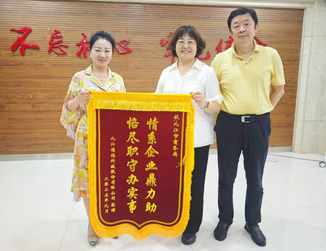 近日,市商务局迎来了暖心的一幕,德福科技副总裁、董事会秘书吴丹妮满怀感激地向市商务局赠送一面锦旗,上书 “情系企业鼎立助 恪尽职守办实事”,以此表达对市商务局积极作为、高效服务的诚挚谢意。这面锦旗不仅是企业对政府部门工作的认可,更是双方携手共进、推动产业国际化发展的见证。