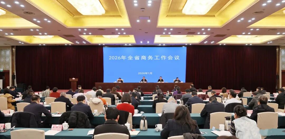 1月22日,全省商务工作会议在南昌召开。会议以习近平新时代中国特色社会主义思想为指导,深入贯彻落实党的二十大、二十届历次全会和中央经济工作会议精神,深化落实习近平总书记考察江西重要讲话精神,认真贯彻落实省委十五届九次全会和省委经济工作会议精神,总结2025年和“十四五”工作,研究“十五五”目标任务,部署2026年工作。省商务厅党组书记、厅长犹𬎆出席会议并讲话。省商务厅党组成员、副厅长彭峰主持会议。